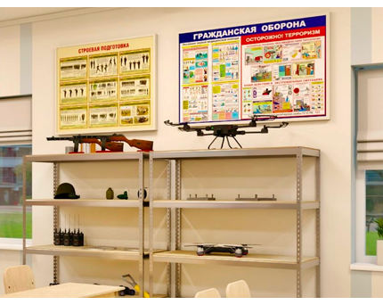 В кабинете есть раздел, посвященный начальной военной подготовке. Здесь школьники знакомятся с основами строевой подготовки, изучают устройство оружия (на макетах), учатся читать карты и ориентироваться на местности. - Патриотический уголок