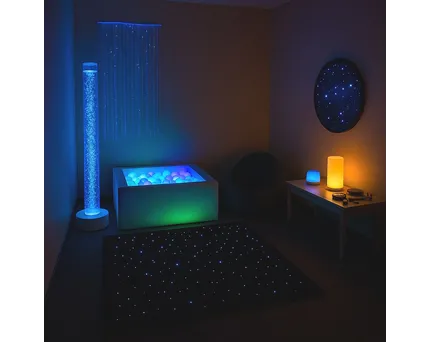 Яркие, но мягкие визуальные стимулы притягивают внимание малышей, помогают концентрироваться. Здесь устанавливают световые столы, проекторы «звёздное небо», пузырьковые колонны, фиброоптические нити. Световые эффекты создают волшебную атмосферу, позволяют проводить занятия на развитие воображения.
