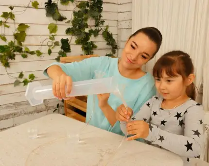 - Подготовка к школе. В ходе эксперимента получают полезные навыки: например, считают количество реагентов, изучают цветовую палитру, засекают время по часам.