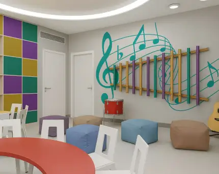 - Физическое пространство и акустика. Помещение, где проходят занятия, должно обладать хорошими акустическими характеристиками. Важно, чтобы звук распространялся равномерно, не искажался и не поглощался стенами или мебелью. Также необходимо предусмотреть звукоизоляцию, чтобы занятия не мешали другим классам. Пространство должно быть достаточно вместительным для организации как индивидуальной, так и групповой работы.
