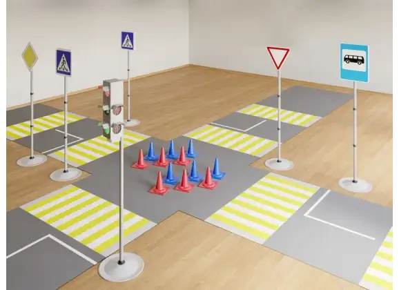 Товар имеет сертификацию по требованиям ФГОС. Комплекс изготовлен из качественных материалов, которые не вредят здоровью детей во время обучения. Оборудование имитирует настоящую улицу со всеми знаками дорожного движения. Состав комплекса: светофор, дорожные знаки, ролевые жилеты (водитель грузовика, автомобиля, скорой помощи, пожарной машины, мотоциклист, велосипедист, ролле, самокат), а также конусы, рули, которые имитируют транспорт, светоотражающие значки.