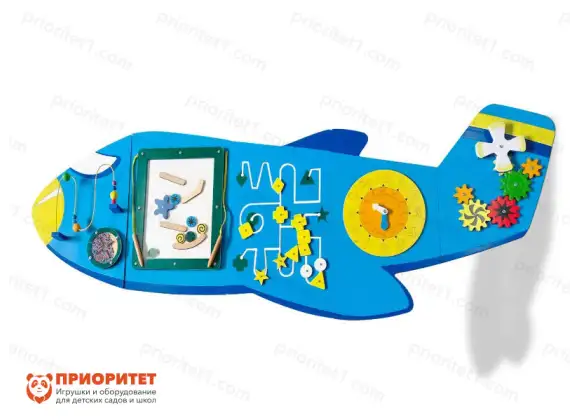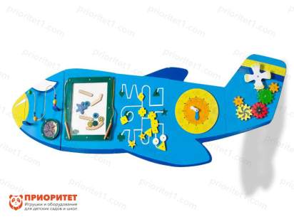 Бизиборд выполнен в виде яркого большого самолета. Самолет увезет ребятишек в страну знаний, где их ждут интересные задания и игры. Панель подойдет для дошкольников и младших школьников. Может использоваться в детских садах, школах, развивающих и развлекательных центрах, в кабинетах психолога или логопеда, дома.