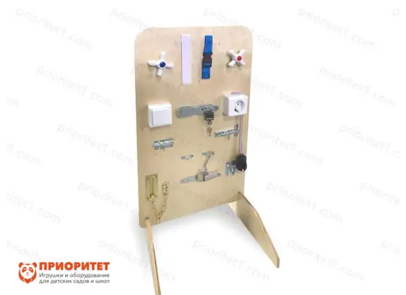 Материал изделия: неокрашенная фанера, металл, пластик. Бизиборд выполнен из материалов безопасных для детей. Все элементы прочно закреплены.