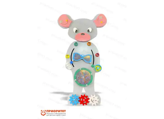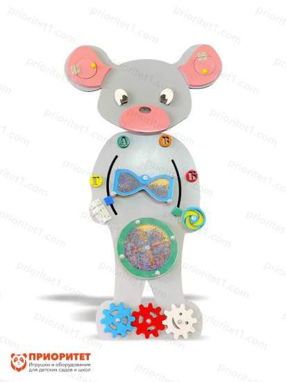 На настенной панели бизиборда «Добрая мышка» крепится несколько интерактивных зон, которые можно полноценно задействовать во время занятий.