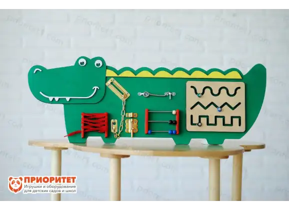 Бизиборд изготовлен в форме дружелюбного крокодила. Этот опасный и хищный зверь в душе очень мягкий и добрый и любит играть с детишками. Вместе с крокодильчиком ребятишки отправятся в страну знаний, столкнутся со сложными и интересными задачами и преодолеют все препятствия. Яркая и стильная бизидоска станет украшением игровой зоны и займет достойное место среди дидактических игрушек. Панель богата разнообразием полезных элементов. Идеальный вариант для комфортного развития.