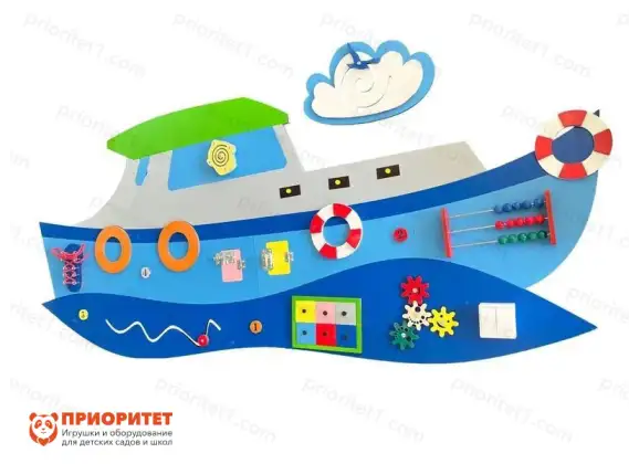- Бизиборд сделан в декоративном стиле в форме фрегата. Дети с увлечением изучают детали корабля и узнают о профессии моряка.