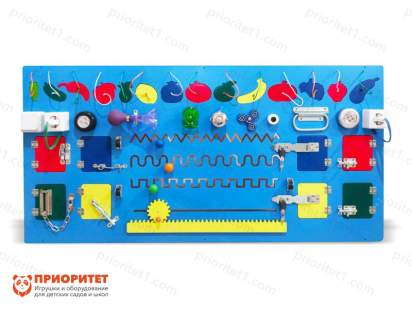 - Основа бизиборда сделана из фанеры высшего качества: доска была тщательно отшлифована и покрыта лаком, чтобы ребята не получили занозы. Остальные детали сделаны из металла или качественного пластика, который не ломается при ударе.