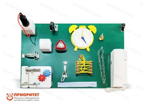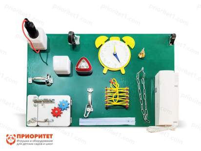 На бизиборде расположены предметы домашнего обихода, с которыми регулярно сталкивается ребенок: розетка, дверной замок, колесики, телефонная трубка, молнии, шнуровки и многое другое. Манипулируя этими предметами, ребенок в безопасной среде знакомится с предметами окружающего мира и развивает мелкую моторику.