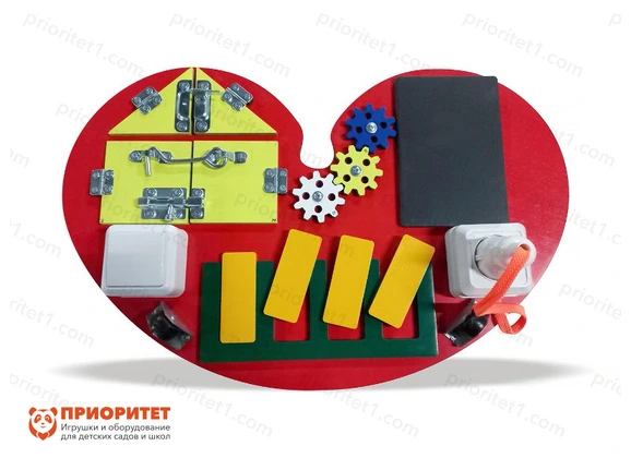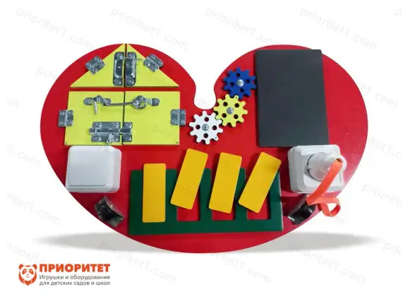 Основа бизиборда выполнена в форме сердца, только без острых углов, чтобы малыши случайно не навредили себе во время игры. Все элементы на доске предназначены для интеллектуального и физического развития малышей. В процессе игры вырабатывается понимание пространства и расположения предметов в нем, отыскиваются связи и общие характеристики элементов, тренируется логическое мышление и мелкая моторика.