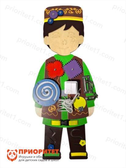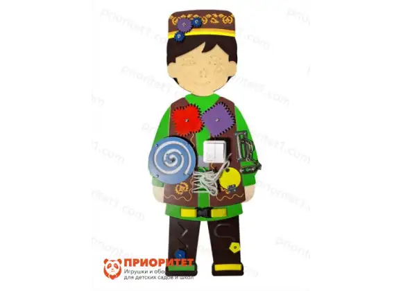 Бизиборд «Ильназ» представлен деревянной игровой панелью, которая выполнена в виде фигуры мальчика в традиционном татарском костюме. Он оснащен различными активностями и игровыми элементами. Мальчика Ильназ одет в национальный татарский костюм. Это яркое и красочное изображение призвано познакомить детей с культурой и национальными традициями татарского народа. Оно также может служить стимулом для изучения иностранных культур и расширения общего кругозора. Игрушка предназначена для детей от одного года до семи лет.