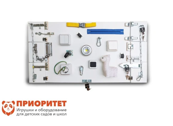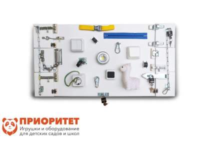 Бизиборд «Нужные навыки» позволяет обучить ребенка простым действиям, которые понадобятся ежедневно в повседневной жизни. Доска оснащена следующими элементами: