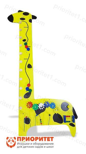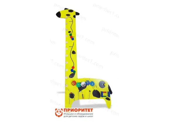 Детская комната должна быть наполнена не только ярким, но и полезным декором. Хороший вариант – бизиборд-ростомер «Очаровательный жираф». Он отличается крупным размером, легко крепится к стене. Производитель наполнил каждый сантиметр пространства развивающими элементами.