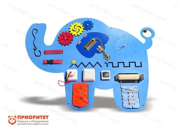 Развивающий бизиборд «Сказочный слоненок» представлен в виде веселого голубого слоненка, который подарит ребенку позитив во время занятий. С таким сказочным слоненком играть и развиваться одновременно одно удовольствие. Этот тренажер станет любимой развивающей игрушкой малышей от 1 года, ведь дети в таком возрасте любят трогать, двигать и дергать всякие предметы. На этом бизиборде большое количество элементов: яркие шестеренки, шнурки, пуговицы, головоломки, вилка и розетка, молния, шпингалет, крутящийся валик.