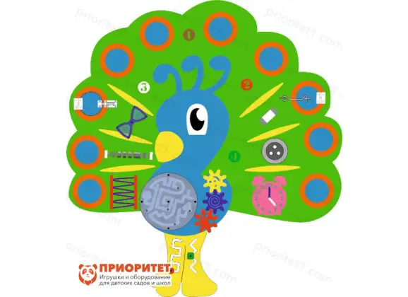 Павлин – один из ярчайших представителей птиц. Он красочный, элегантный, пушистый. Его широкие перья на хвосте роскошны. Бизиборд наполнен множеством полезных развивающих элементов. Панель можно использовать для работы с детьми, имеющими особые потребности.
