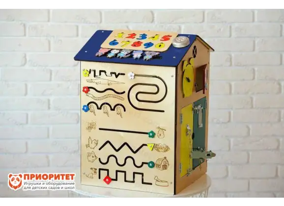 Бизидом «Находчивый непоседа» с крышей яркого синего оттенка подойдет для обустройства детской комнаты. Этот увлекательный комплекс состоит из шести сторон с разнообразными игровыми и тактильными предметами. Интересный дизайн и большое количество развивающих элементов заинтересуют детей на долгое время. В процессе игры с бизидомиком дети учатся решать задачи самостоятельно, развивают усидчивость и внимание, а также пространственное и логическое мышление
