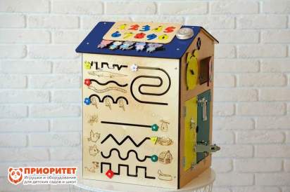 Товар имеет сертификацию по требованиям ФГОС. Домик изготовлен из качественного и экологичного дерева, поверхность которого тщательно отшлифована и обработана. На домике нет острых элементов, которые могли бы навредить здоровью малышей. Синяя краска не выделяет токсины при воздействии на нее солнечных лучей, она гипоаллергенна. Развивающий комплекс позволяет заниматься в группах и индивидуально. Подходит для детей от 3 лет.