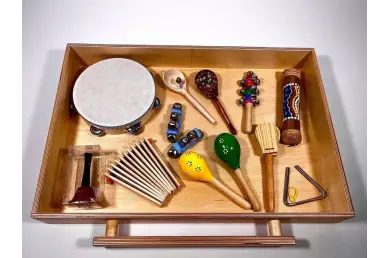 В комплект входят инструменты для шумового оркестра и другие материалы. Их можно использовать для развития слуха, чувства ритма, воображения.