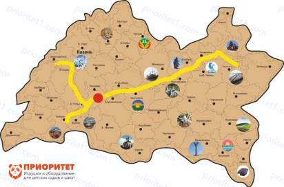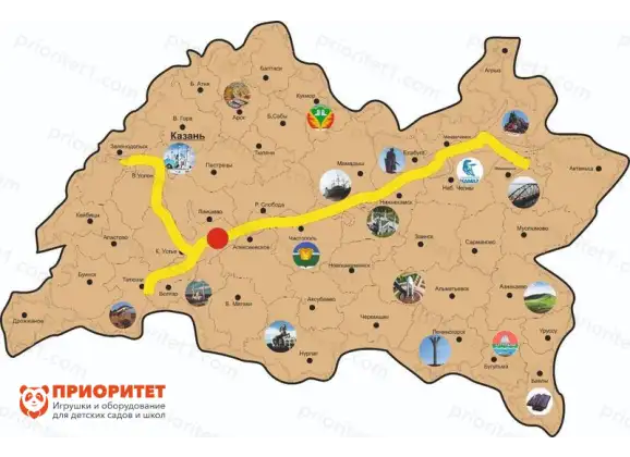 Познакомьте детей с богатой и разнообразной культурой Татарстана с помощью «Большой карты Республики Татарстан»! Панель представляет собой яркую и детализированную карту Республики Татарстан, на которой представлены города, природные достопримечательности, исторические памятники, символы республики, что позволяет изучать географию региона в контексте истории и культуры.