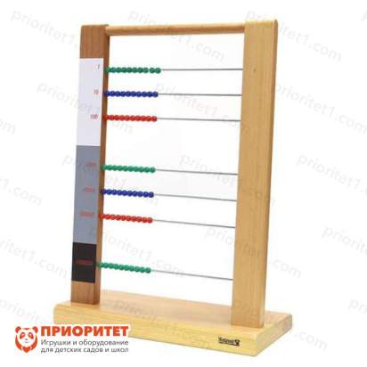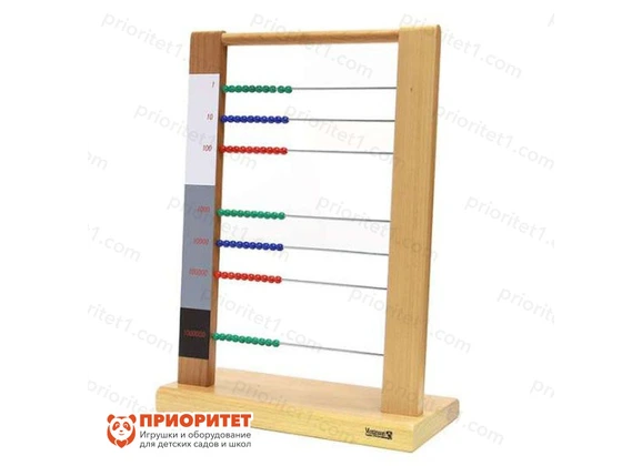 Для изучения десятичных отношений Монтессори предоставляет детям специальные для этой цели счеты. Они просты в применении и понимании. Представляют собой раму с шестью спицами, на каждой из которых прикреплены бусины. Спицы прикреплены не на одинаковом расстоянии, а разделив по три ряда и последний, седьмой, отдельно внизу. Для облегчения запоминания, шарики окрашены в разные цвета. Отмечены и категории – до 100, до 10000 и свыше.