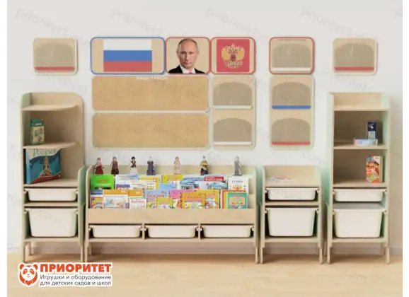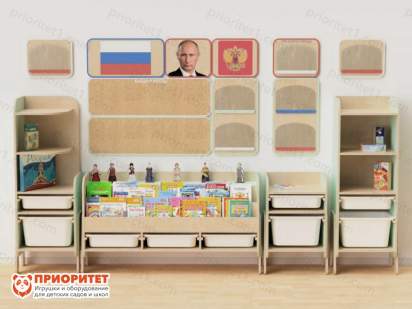 Набор содержит основные символы РФ, пробковые панели, предназначенные для размещения работ детей или наглядных материалов, книги на тему ценностей семьи, книги по истории страны, раскраски. Большой уголок патриотического воспитания соответствует всем требованиям ФГОС.