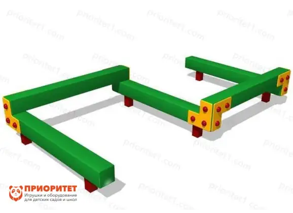 - Предмет собирается из фанеры, бруса и профильной трубы (сечение 60*60*2 мм). Гладкость обеспечена наличием шлифовки на всей поверхности. Предмет используется детьми любых возрастов и безопасен для их нежной и тонкой кожи.
