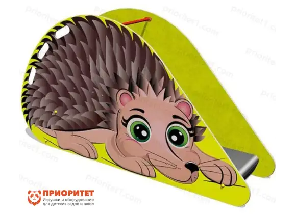 - Горка выполнена в стандартной форме: ступени наверх и небольшой скат вниз. Покрашено в желтый цвет и имеет изображение ежика на корпусе, который привлекает детей.