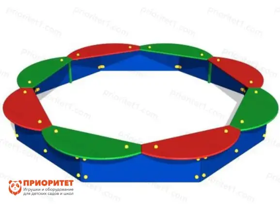Песочница напоминает цветок с разноцветными лепестками. Каждый лепесток – это скамья или столик для детей. Песочница оформлена таким образом, чтобы группа детей могла без затруднений занять сидячие места по периметру круга – основы песочницы. Предмет используется в детской игровой и образовательной деятельности. Он устанавливается в частные зоны или в зоны, прилегающие к общественным учреждениям.