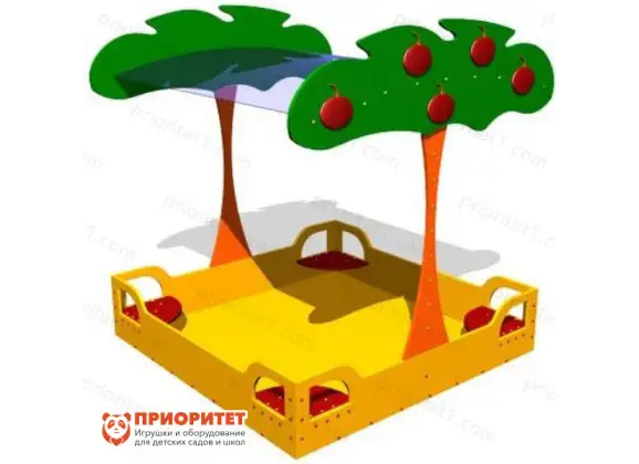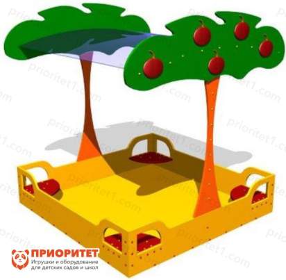 - Песочница с деревьями. По краям песочницы «растут» яблони. Они не могут упасть на ребенка (крепление в комплекте). Ребенок может разыгрывать сценки из сказов, используя данные декорации.