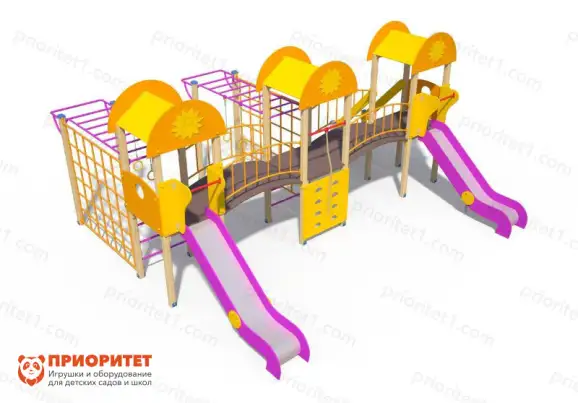 Игровой комплекс выполнен в тематике активных спортивных игр. Такая игровая зона быстро станет любимым местом среди детворы. Здесь дети смогут свободно бегать, играть, кататься, общаться и веселиться. Комплекс можно назначить местом встреч для друзей. Конструкция оснащена горками с бортиками и шведской стенкой. Дополнительно имеется пространство для передвижения. Комплекс можно установить на придворных детских площадках, игровых зонах учебных заведений либо в частном секторе.