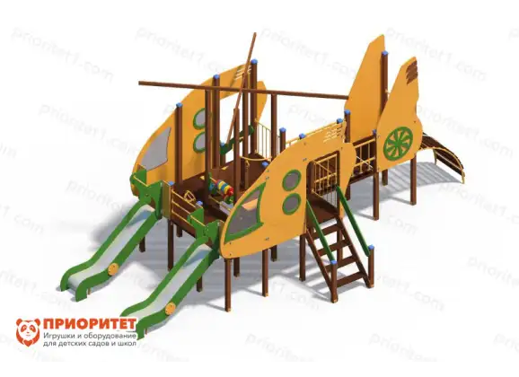 Игровой комплекс выполнен в виде воздушного судна. Такая игровая зона быстро станет любимым местом среди детворы. Здесь дети смогут свободно бегать, играть, кататься, общаться и веселиться. Комплекс можно назначить местом встреч для друзей. Конструкция оснащена горкой с бортиками и перекладинами. Дополнительно имеется пространство для передвижения. Комплекс можно установить на придворных детских площадках, игровых зонах учебных заведений либо в частном секторе.