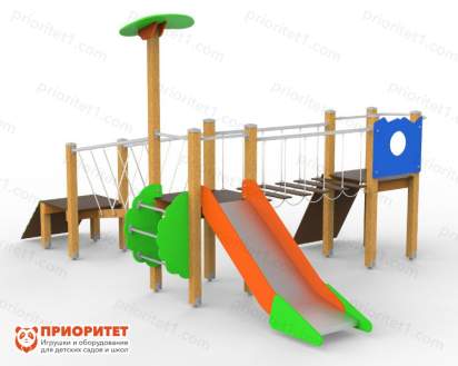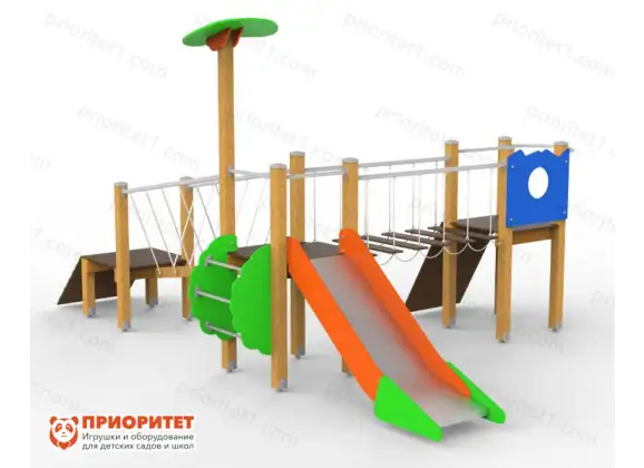 Игровой комплекс для детей «Таежник» сделает прогулку детей веселее, насыщеннее, полезнее и ярче. Комплекс стилизован в тематике тайги, на нем изображены деревья, есть подвесной мост, горка, лестница и переходы.