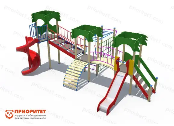 Игровой комплекс выполнен в тематике диких джунглей. Такая игровая зона быстро станет любимым местом среди детворы. Здесь дети смогут свободно бегать, играть, кататься, общаться и веселиться. Комплекс можно назначить местом встреч для друзей. Конструкция оснащена горкой с бортиками, скалодромом, кольцами и турниками. Дополнительно имеется пространство для передвижения. Комплекс можно установить на придворных детских площадках, игровых зонах учебных заведений либо в частном секторе.