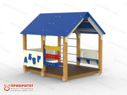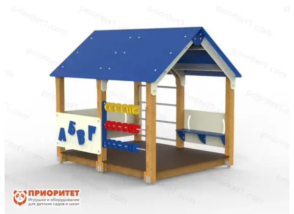 Уличный деревянный домик-беседка классической прямоугольной формы, с открытыми стенами и двускатной синей крышей. Оформлен в теме "школы". В проемах установлены обучающие элементы: декоративные белые панели с буквами, большие деревянные, разноцветные счеты и перекладины. Есть и небольшие скамеечки.