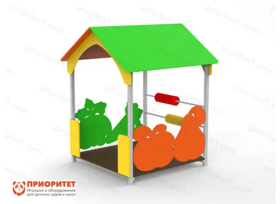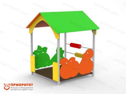 Детский домик — обязательный атрибут любой площадки, без него нельзя представить сюжетные игры в дочки-матери или в волшебный замок. Стенки домика по форме похожи на разные фрукты, они яркие и позитивные. Одна из стен представляет собой огромные счеты с цветными костяшками.