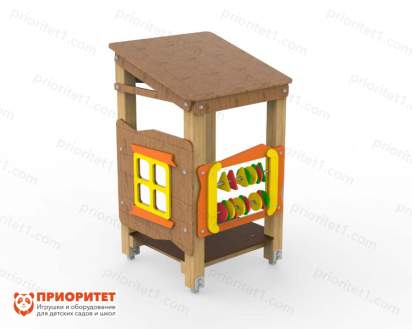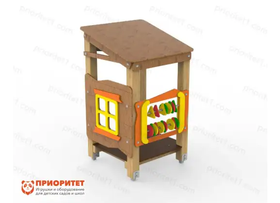 В домик легко зайти и выйти. Одна из стен имеет окошечко, на второй в два ряда расположены счеты с разноцветными костяшками.