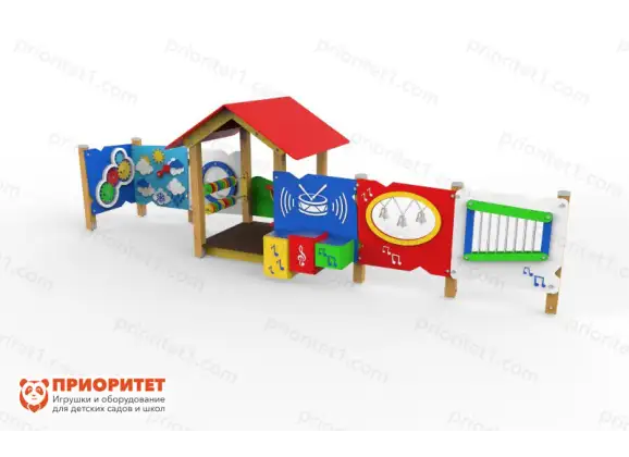 Яркие стенды имеют следующие элементы: шестеренки, стрелки, шайбы и колокольчики. Внешний вид площадки напоминает музыкальный оркестр. Можно использовать конструкцию для организации сюжетно-ролевой игры. Пусть малыши почувствуют себя музыкантами.