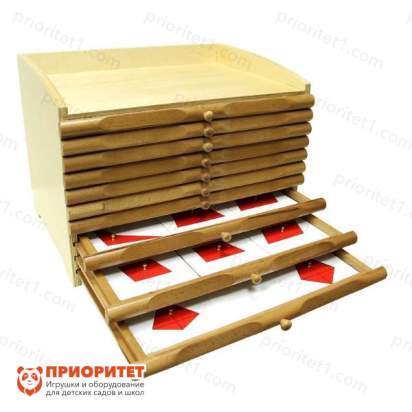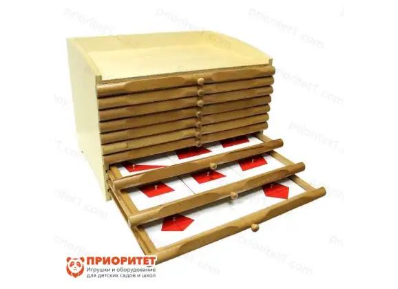- Представляет собой развивающую игру, выполненную в виде комода: имеет 10 выдвижных полок, в которые вставлены рамки-вкладыши разных геометрических форм: круги, треугольники, ромбы и пр.