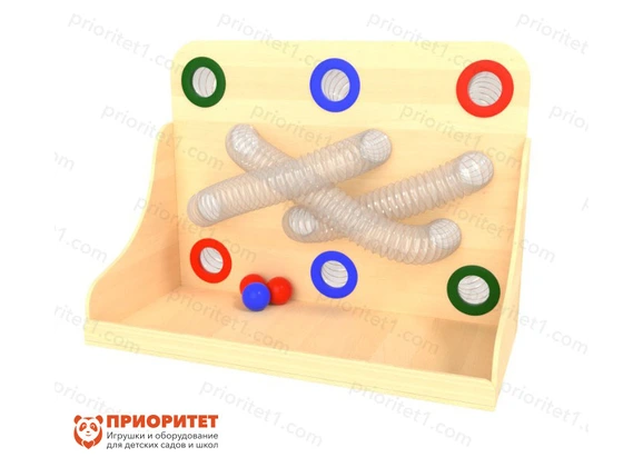 - Игрушка состоит из деревянной панели с одной большой стенкой и двумя маленькими боковыми перегородками. В большой стенке есть несколько отверстий, края которых покрашены в синий, зелёный и красный цвет. К этим отверстиям присоединены трубки, по которых катаются шарики.