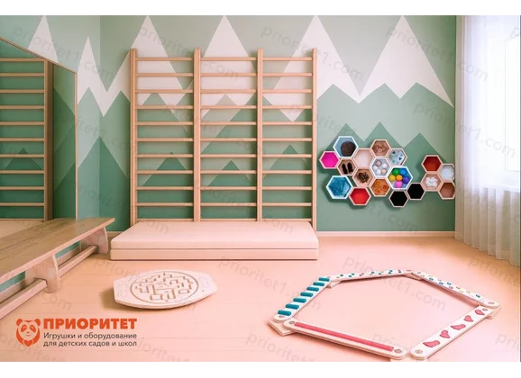 - Шведские стенки детские – 3 шт. Размеры, Д х Ш х В, см: 240х71х16. Применяются для укрепления мышц, восстановления подвижности и улучшения координации движений.