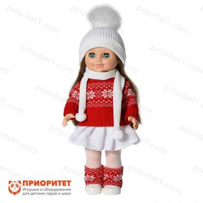 - Кукла одета в теплый костюм: белое платье, колготки, гетры и туфельки, мягкий свитер с приятным узором, шапочка с большим помпоном и шарфик.
