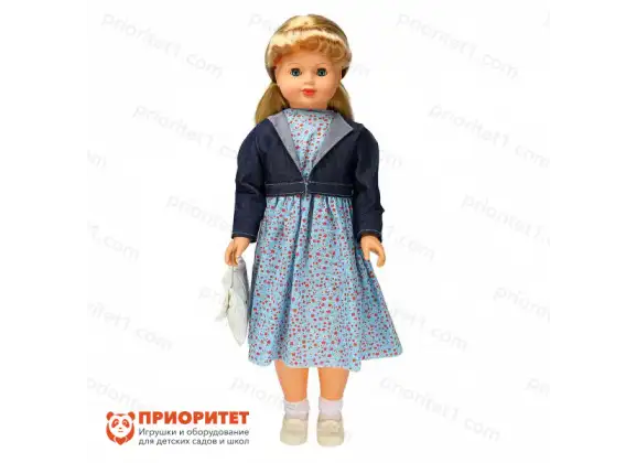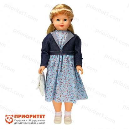 Кукла одета в летнее платье-сарафан из хлопчатобумажной ткани, сверху джинсовая куртка, трикотажные носки и туфли. Образ завершает красивая дамская сумочка белого цвета.