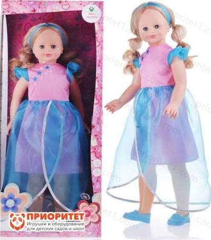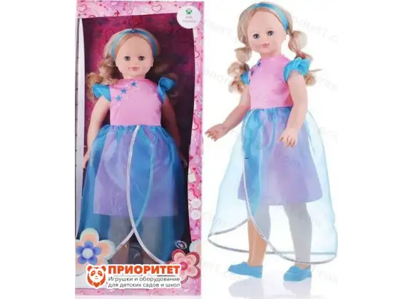 Яркий праздничный наряд не оставит без внимания ни детей, ни взрослых. Голубая тесьма в волосах дополняет и завершает весь образ. Ножки защищены туфлями на случай прогулки по асфальту. Качественный нейлон имитирует натуральные волосы. Они легко расчесываются и заплетаются в различные прически.