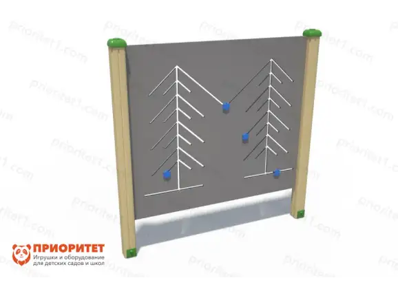 - Представляет собой вертикальную панель, расположенную на двух ножках. На доске вырезаны два идентичных изображения елки, по которым передвигаются игровые бегунки. Задача малышей – передвинуть бегунки от одной елки к другой.