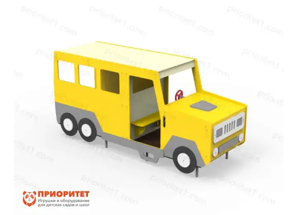 Модуль отлично подходит для групповых игр на детских площадках. Объект в виде школьного автобуса сделан из прочной фанеры типа ФСФ. Этот материал обладает рядом преимуществ: повышенная водостойкость, стойко переносит температурные перепады, механическая прочность, отлично держит форму. Краска подбирается с учетом того, что игровой модуль будет всегда находиться под открытым небом.