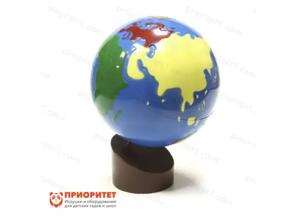 Глобус выполнен в классическом виде: шар на прочной устойчивой подставке. На глобусе имеются континенты, моря и океаны. Континенты выступающие, окрашены в разные цвета. Окраска соответствует карте 6.01 из набора континентов на карте Монтессори.