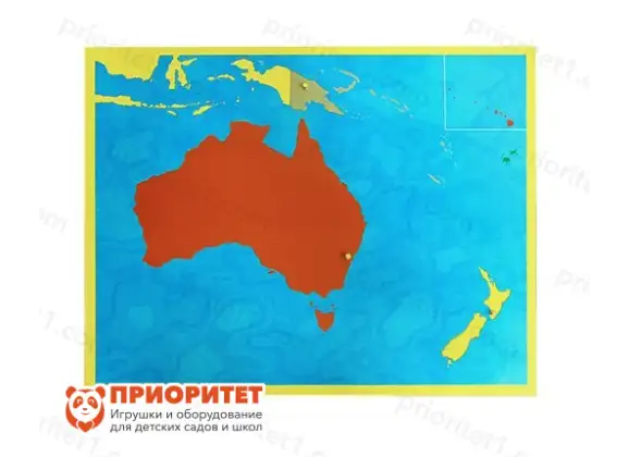 Карта Океании представлена как отдельная сфера для изучения. Вопреки прочим представлениям, Океания содержит не только воду и отдельные острова, но и материк. Сверху карты есть остров, половина которого относится к Австралии и является частью Океании. Все элементы суши являются деталями пазла, их можно вытащить за удобные ручки и вставить на места. В квадрате, расположенном в правом верхнем углу, прорисованы острова, которые не видно невооруженным глазом из-за их маленького размера.