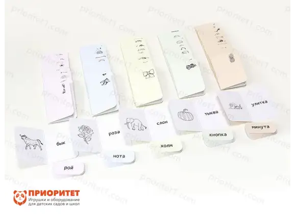- Материалы имеют несколько уровней сложности, разделенных по цвету: розовый, голубой, желтый, зеленый и бежевый. Так ребята могут начать обучение с простых односложных слов, а закончить трудными.