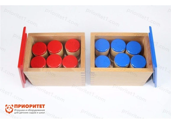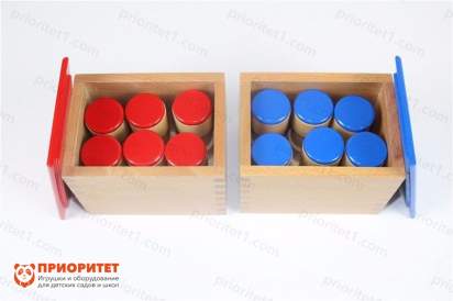 Игровой набор представляет собой две деревянные коробочки из бука с крышками двух цветов. В каждой из них размещено по 6 цилиндров с крышками соответствующего цвета. Встряхивая цилиндр, он издает свой шум. Занятия с таким материалом развивает внимание, слуховое восприятие, концентрацию. Применяется в развивающих и коррекционных центрах в качестве сенсорной интеграции. Косвенно ребенок подготовится к музыкальным занятиям и работе в тишине.