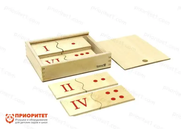 Игровой набор Монтессори предназначен для обучения детей счету римскими цифрами. Игра выполнена по принципу лото. В наборе имеется 10 пар карточек, которые поделены на пары: одна карточка с римской цифрой, а вторая – с точками в количестве равном цифре. Каждая карточка имеет уникальную неровную грань, которая совпадет с гранью другой карточки только при правильном подборе пары. Это помогает ребенку убедиться в правильности своего решения и закрепить новое знание.