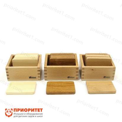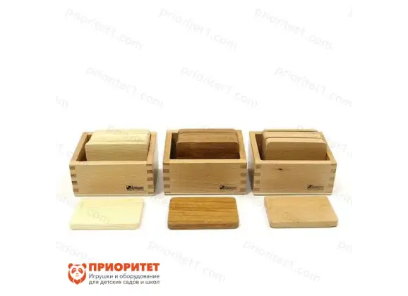 - Представляет собой небольшие деревянные таблички: каждая сделана из разных пород дерева, благодаря чему имеет индивидуальный вес и цвет. Задача ребенка – взвесить таблички на руках и установить их в сериационный ряд: от легкой до тяжелой.